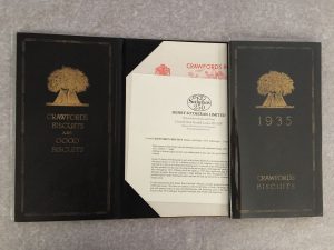 biscuiterie écossaise Crawford, créée en 1813. Elle est formée d’un sous-main comprenant plusieurs dizaines de feuilles imprimées et de deux carnets, celui de gauche constituant le catalogue illustré en couleurs des produits de la marque, celui de droite constituant l’agenda pour 1935.{CR}Le document fermé mesure 275 x 305 mm et 275 x 615 mm ouvert.{CR}Exemplaire en parfait état et absolument complet. Rare.
