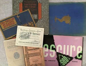 salis.{CR}- ECLIPSE STOVE COMPANY. The Taylor rolling kitchen. Mansfield, [vers 1920]. — In-8 oblong. Agrafé, couverture illustrée en couleurs sur papier brun.{CR}Rare document publicitaire sur la cuisinière roulante Taylor, illustré de nombreuses photographies en noir et blanc. Trace de rouille aux agrafes, rousseurs éparses. Première de couverture légèrement froissée.{CR}- BRIFFAULT. Tarif 1023. Société anonyme des Fourneaux Briffaut. Paris, 1923. — In-8, agrafée. Comprend deux dépliants avec la reproduction des différents fourneaux.{CR}- SOMMET ET CIE. [Catalogue]. Paris, 1930. — In-folio, couverture illustrée. Broché.{CR}Catalogue illustré à prix marqué de moules pour pâtés, cakes, aspics biscuits, gelées, galantines, brioches, tartes, flans, pièces montées, madeleines, etc. ainsi que plusieurs accessoires de cuisine. Couverture défraîchie. Découpures avec manque à trois feuillets.{CR}- BASTIAN –BLESSING CO. New and improved models of ever lustrous soda fountains and counters… Chicago, 1932. — In-4, couverture illustrée en couleurs, broché, agrafé. Catalogue de mobilier de bars et de cuisines pour restaurant, illustré de compositions en noir et en couleurs.{CR}- BRIFFAULT. Manufacture de fourneaux de cuisine Mon. Briffault. Paris, [sans date]. — In-12 oblong, (2 ff.).{CR}Brochure publicitaire de 2 feuillets illustrés de nombreuses reproductions de matériels de cuisine (batterie de cuisine, moules à pâtisserie, moules à glaces). Très bon état.{CR}- SEB. Album du centenaire. Selongey, 1957. — In-4 oblong, couverture illustrée d’Auguste LEROUX. Reliures à spirales.{CR}Catalogue bilingue (français/anglais) imprimé pour le centenaire de la maison SEB. Il possède deux reliures celle de gauche retenant les feuillets en français, celle de droite la partie anglaise du catalogue. Nombreuses illustrations et photographies dans le texte. Au dos figure la devise « Seb Sebo Sebon ».