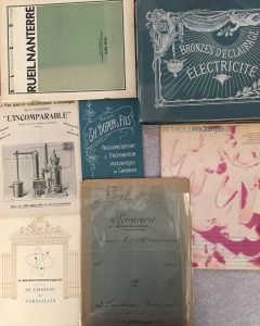houille. Petite déchirure et deux trous d’agrafe à la couverture.{CR}- BOULANGER. Manufacture de bronzes et d’appareils d’éclairage. Électricité et Gaz. Paris, [vers 1915]. — In-4 oblong. Toile bleue de l’éditeur, ornée sur le premier plat d’une belle composition argentée. Plus de 200 planches montées sur onglet. Rousseurs au titre.{CR}- FAUCHIER. Mémoire des travaux d’électricité exécutés pour le compte de Monsieur Dorémieux. Paris, 1931. — Manuscrit in-4, agrafé. Rapport d’intervention dans la propriété de M. Dorémieux rue de la Pompe à Paris.{CR}- Société Lyonnaise des Eaux et de l’Éclairage. Rueil Nanterre. 57e congrès de l’Industrie du Gaz de France juin 1934. Paris : Paul-Martial, 1934. — In-4, agrafé.{CR}Très belle publication illustrée de 40 photographies industrielles publicitaires en noir de Pierre DUBURE et PAUL-MARTIAL. Couverture insolée.{CR}- GAZOGENE. Le Gaz pauvre véritablement économique. Paris, [sans date]. — 2 ff. in-4.{CR}Brochure de promotion de l’Incomparable, gazogène permettant d’obtenir un gaz pauvre économique. On joint le prospectus de la maison Delion & Lepeu, fabricant du moteur à Gaz D.L.{CR}- L’Électronique entre au Château de Versailles. Paris, 1958. — In-4, couverture illustrée. Agrafé. Belle plaquette illustrée, publiée dans un but de documentation technique, concernant la modernisation de l’Opéra Louis XV à Versailles.{CR}- Pétrole progrès. Revue trimestrielle printemps 1972. Imprimerie Crété, 1972. In-4, agrafé, couverture artistique en polychlorure de vinyle.{CR}« Pour ce numéro (91), consacré particulièrement aux matières plastiques dans la sculpture contemporaine, Hervé Fischer a conçu une couverture inhabituelle, réalisée en polychlorure de vinyle cristal par la Société CIFAM. » Il est illustré de nombreuses photographies d’œuvres de KOWALSKI, DUBUFFET, CÉSAR, DUFO…
