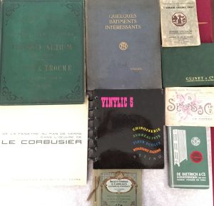 planches collées les unes avec les autres ont entraîné des déchirures.{CR}- VAN OVERSTRAETEN. Société générale de carrelages et de produits céramiques. Carreaux en grès Cérame. Paris : Laferrière, [vers 1910]. — In-16 oblong, couverture illustrée. Broché, cordonnet de soie vert.{CR}Recueil de planches en couleurs, parfois dépliantes, proposant divers modèles de carrelages en céramique. Bel exemplaire malgré la couverture insolée.{CR}- DE DIETRICH. [Catalogue général]. Niederbronn, [vers 1930]. — In-12, toile verte de l’éditeur. Catalogue illustré de chaudières, d’accessoires, de radiateurs, de robinetterie, etc. Joint un feuillet publicitaire pour la chaudière diamant de Dietrich.{CR}- ALAZARD - HEBERT. De la fenêtre au pan de verre dans l’œuvre de Le Corbusier. Paris, 1961. — In-4 oblong. Cartonnage de l’éditeur.{CR}Nombreuses photographies par FICHTER, HERVÉ, JOLY et VERA CARDOT.{CR}- CAC. Vinylic 5. Paris, s.d. — Classeur d’échantillons de toile cirée.{CR}- GUINET. Carrières françaises de marbres. Lyon, s.d. — Classeur in-16.{CR}Classeur d’échantillons de marbres reproduits à l’aide de photographies en couleurs.{CR}- JAVON & TROCMÉ. Ornements pour le Bâtiment et l’Architecture en Zinc, Cuivre, Tôle & Plomb. Album Dixième Tirage. Paris, s.d. — In-4, percaline verte de l’éditeur. Exemplaire gauchi, quelques feuillets en partie déreliés, déchirures aux premiers feuillets.{CR}- SAINT-GOBAIN, CHAUNY, CIREY. Manufactures des glaces et produits chimiques de Saint-Gobain, Chauny, Cirey. Verres spéciaux. Bruxelles : Onkelinx, [sans date]. — {CR}In-16, couverture illustrée, couverture retenue par des attaches parisiennes. Couverture un peu frottée. Rousseurs. Déchirure (environ 6 cm) au second plat de couverture.{CR}- STIGLER. Quelques bâtiments intéressants. S.l., s.d. — In-4, cartonnage de l’éditeur.{CR}Album publié à l’occasion de la fourniture du 15 000e ascenseur Stigler, illustré de près de 200 photographies de bâtiments pourvus d’un ou plusieurs ascenseurs de la marque. Cartonnage légèrement abîmé.
