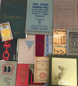 Vernis pour carrosseries, bâtiments & marine. Haren, Nord, Bruxelles : E. Allard, [vers 1910]. — Dépliant in-16.{CR}Dépliant donnant un échantillon de 54 couleurs d’émail proposées par les usines Colorin. Chaque échantillon se présente sous la forme d’une pastille.{CR}- BUFFARD. Marqueterie - quadrillages – filets simples et bandes Mosaïque. Paris, [1922]. — In-4, agrafé, cordonnet de soie verte.{CR}On joint la liste des prix de 1922, ainsi que deux autres prospectus de la même maison.{CR}- GIBERT. Grillages. Paris, 1913. — 4 brochures in-12 sous chemise de percaline bordeaux de l’éditeur. Grillages et de tapis métalliques. {CR}- Manufacture vosgienne de volets roulants en bois et en fer. Saint-Dié, (années 20). — In-4, agrafé.{CR}- POLIET & CHAUSSON. Ciment Pierre. Paris, 1923. — Catalogue illustré in-8, agrafé.{CR}- FOURMAINTRAUX & DELASSUS. Les grés grand-feu d’architecture de Ch. Fourmaintraux et Delassus. Paris, 1925. — In-4, couverture imprimée. Broché.{CR}Catalogue de cheminées art déco en couleurs.{CR}- GAUDIER REMBAUX. Monuments funéraires. Société granitière du Nord Gaudier-Rembaux. Aulnoye, 1925. — In-8, broché. Belle couverture.{CR}- NATIONAL RADIATOR COMPANY. Catalogue des radiateurs, chaudières, réservoirs, accessoires, robinetterie, outillage « Idéal ». Vilvorde, [1926]. — In-12, broché.{CR}Joint une brochure publicitaire de la compagnie concernant deux robinets. Quelques usures d’usage.{CR}- FER FOR. Balcons, balustrades, appuis, panneaux en fer forgé. Corbeil : impr. Crété, 1929. — In-8, broché.{CR}- LYS. Céramiques de la Lys S.A. Marcke-Lez-Courtrai, [vers 1930]. — In-8, en feuilles tenues par 2 anneaux.{CR}Album de plus de 50 exemples de sols en carrés de céramique. Couverture illustrée. Usures au dos. {CR}- ROMBAUD-ROLAND. Monuments & Chapelles, soubassements et devantures de vitrines pour magasins en tous granits, de toutes teintes, de toutes provenances. Jeumont, octobre 1930. — In-4, broché.{CR}Album entièrement illustré de photographies de monuments, devantures, etc. dont les galeries Lafayette à Paris.{CR}- BÉTON ARMÉ. N° 356. Octobre 1937. Lille, 1937. — Fascicule in-folio, agrafé. N° 356 de cette revue mensuelle technique et documentaire des constructions en béton armé. Déchirure à la couverture. Nombreuses publicités aux premiers et derniers feuillets. Joint une brochure de la société « Bétons Armés Hennebique ».{CR}- La Construction métallique et le béton armé dans les bâtiments modernes. Paris : impr. L. Pascal, s.d. — In-12, agrafé. Article publicitaire, extrait de la revue Science & industrie, n° 157.{CR}- Office public d’habitations à loyer modéré du département du Rhône. 1920-1970. Lyon : HLM du Rhône, 1970. — In-4 carré, toile verte de l’éditeur ornée sur le premier plat d’une plaque dorée imprimée, étui.{CR}Publication réalisée à l’occasion du cinquantenaire de l’office HLM du Rhône. Elle est illustrée de très nombreuses photographies en noir et en couleurs.{CR}- COLOZIER & Cie. Carrelages Céramiques. Carreaux unicolores en grès Cérame. Saint-Just-des-Marais, s.d. — Catalogue dépliant illustré in-12.