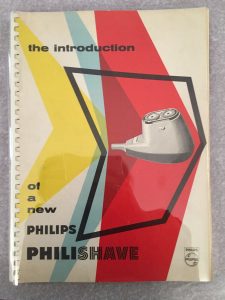 [ÉLECTROMÉNAGER] PHILIPS. The introduction of a new Philips Philishave. Eindhoven, 1958. — In-folio, couverture illustrée. Reliure à spirale. {CR}Important album publicitaire en anglais consacré au rasoir à deux têtes de Philips. Il comprend...