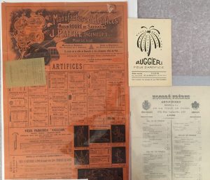 [FÊTES - FEUX D’ARTIFICE]. Ensemble de 3 brochures :{CR}- HONORÉ FRÈRES ARTIFICIERS. [Liste de prix des feux de 50 à 1000 francs]. Paris, [vers 1860]. — 2 ff. in-4.{CR}- MAISON ROURE DE SARRAZIN. Manufacture d’Artifices. Marseille, [Vers...