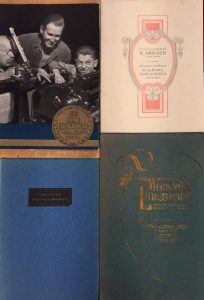 rempliée, donnant un échantillon des travaux effectués par la maison Siemers & Jacob imprimeurs lithographes. Chemise restaurée mais présentant tout de même quelques déchirures.{CR}- ARNAUD. Quelques extraits d’albums industriels illustrés. Lyon, Paris, [vers 1930]. – In-4, couverture illustrée. Agrafé.{CR}Catalogue de promotion de l’imprimerie Arnaud, illustré de dessins et de photographies.{CR}- HEIDELBERG. Du nouveau à Heidelberg. - 100 jahre Heidelberger Druckmaschinen. 1950. — 2 catalogues illustrés du constructeur de presses à imprimer Heidelber. Enveloppe.{CR}- COCTEAU (Jean). Éloge de l’imprimerie. Poème. Heelsum : Usines Pannekoek & Cie, [sans date]. — In-4, (6 ff. premier et dernier blancs), couverture avec étiquette imprimée. – Broché, couverture rempliée.{CR}Réimpression pour les usines Pannekoek & Cie de ce poème de Cocteau en l’honneur de l’imprimerie. Exemplaire imprimé et numéroté sur vergé de Hollande Pannekoek (n°263).
