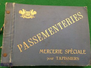 tapissiers et mercerie. À la fin figure un coffret proposant 9 franges avec perles en bois.{CR}Bon exemplaire dans lequel seuls 3 échantillons manquent. Quelques usures à la reliure.