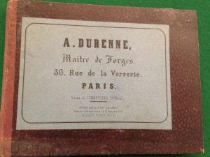 rare du maître de forges A. Durenne, réunissant des centaines de planches d’objets divers allant de la croix aux cuisinières, balustrades de pont, candélabres, etc. qui avaient été publiées entre 1872 et 1876.{CR}Exemplaire très bien conservé. Pliures au dernier feuillet, rousseurs éparses.