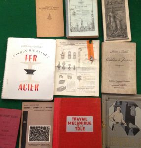 catalogue des établissements métallurgiques A. Durenne. On y trouve répertoriés de nombreux modèles de balcons, balustrades, panneaux de portes, frises de couronnement, pilastres de rampes, etc. Nombreuses reproductions dans le texte. Trace de mouillure sur les plats. Toile du dos légèrement décollé.{CR}- DERIHON. Forges : Estampage : Ateliers de construction. Loncin-Lez-Liège, 1908. — In-4, couverture illustrée. Broché, cordelette jaune, couverture rempliée.{CR}Superbe brochure publicitaire des usines G. Derihon de Liège, illustrée de nombreuses photographies non seulement des produits mais surtout de l’intérieur des usines. La couverture est en outre illustrée d’une belle composition signée de Fischer.{CR}- SIMMON-PERRET FRÈRES. Dixième album des fer & aciers. Lyon, 1911. — In-16, demi-toile rouge d’édition.{CR}- ACIÉRIE & FORGES DE SAINT-FRANÇOIS. Aciers fins fondus au creuset. Manufacture d’outillage de précision. Saint-Étienne, [1926 ?] — In-8, 214 pp. toile imprimée de l’éditeur. Reliure abîmée.{CR}- Travail mécanique de la tôle. Forest, Bruxelles, [1945]. — In-4, demi-toile rouge, plat recouverts de suédine rouge, titre en argent frappé au centre du premier plat.{CR}Bel ouvrage illustré de nombreuses reproductions dans le texte, de photographies par Dietens, Kessels et Alexis, et de nombreuses compositions en couleurs, la plupart contrecollées sur papier fort de couleur avec serpente transparente imprimée.{CR}Bon exemplaire malgré de rares rousseurs sur les tranches.{CR}- Connaissez-vous l’industrie belge ? Fer. Acier. Bruxelles : Banque de Bruxelles, [1950]. — In-4, reliure à spirale, couverture argentée illustrée.{CR}Rare ouvrage publicitaire publié par la Banque de Bruxelles et élaboré par le Bureau de publicité industrielle et commerciale, concernant les industries belges du fer et de l’acier. Les textes sont imprimés sur papier vergé gris et sont entrecoupés de plusieurs feuillets de publicité pour les industries en question. Usures d’usage aux couvertures.{CR}- DUMONT & FRÈRES. Usines à plomb et à Zinc. Sclaigneaux (Belgique), s.d. — Plaquette in-8, agrafée.{CR}- MANUFACTURE MÉTALLURGIQUE GEORGES HOHN. Scellés en acier pour tous genres d’emballages. Bruxelles, s.d. — Feuillet in-4 avec échantillons de 2 scellés.{CR}- TELLIER( Camille). Forges de Louvroil, Camille Tellier à Louvroil (Nord). Paris : Breger & Lang, [sans date]. — In-8 allongé, 46 pp., (1 f.). Demie-toile bleue marine, couverture illustrée.{CR}Catalogue à prix marqués d’outils de forgeron : étaux, boîtes à vis, etc. Taches à la couverture. Nombreuses illustrations. La page 44 présente des traces de déchirures provoquées par un feuillet qui a collé sur la page. Mauvais état.{CR}- Usines à tubes de la Meuse. Flémalle-Haute, [sans date]. — In-8, 47 pp., couverture illustrée. Agrafé.