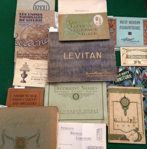dans lequel les motifs sont reproduits en couleurs à raison d’un motif par page. On trouve relié en début de volume un feuillet de prix. Taches à la couverture.{CR}- HOLOPHANE WORKS. Decorative Shades. Roghed, Etched, Veluria. Cleveland, 1914. — In-8 oblong, 32 pp., couverture imprimée. Agrafé.{CR}Catalogue illustré proposant des abats-jours, verres de lampes, appliques… Couverture présentant de fortes brunissures, surtout au second plat.{CR}- GUICHARD-PELLE. Lyon, [1920]. — In-8, 39 pp., couverture illustrée. Broché, lacet de soie beige.{CR}Catalogue illustré en couleurs de la maison Guichard-Pellé, fabricant de rideaux, tapis et tissus d’ameublement. Couverture illustrée par Pierre-A Vincent, dans le style art nouveau. Taches et rousseurs à la couverture.{CR}- BAUDEMANT. Glaces et Miroirs. H. Baudemant. Paris : Thierry Buttner, [1923 ?]. — In-4 oblong, 36 pp. Broché, couverture de papier vert imprimé en relief en lettres dorées retenue par un cordonnet de soie verte.{CR}Bien complet de la plaquette de 8 feuillets donnant les prix des objets proposés dans le catalogue. Nombreuses illustrations. On joint divers documents relatifs aux établissements Baudemant. Couverture insolée. Premier feuillet de garde partiellement dérelié.{CR}- VIGIER. Les Tapis végétaux Vigier. Paris : imp. De l’Est, [après 1923]. — In-8 oblong, (12 ff.), couverture illustrée. Broché, cordonnet beige.{CR}Catalogue présentant la collection de tapis de la maison Vigier. Nombreuses illustrations en couleurs. Couverture insolée.{CR}- USINES NATIONALE DE LITERIE. Le Pré Saint Gervais, 1928. — Beau catalogue illustré in-8. Agrafé.{CR}- WIDDICOMB. Bed room furniture. January 1929. Michigan, 1929. — In-8 oblong, (12 ff.), couverture illustrée en couleurs. Agrafé.{CR}Catalogue de meubles pour chambres à coucher, accompagné de la liste des prix. Nombreuses photographies en couleurs dans le texte. Couverture insolée et tachée.{CR}- FOLDING BEDS LTD. Double-Duty furniture. Londres, vers 1930. — Brochure in-4, 280 x 221. Catalogue illustré de lits pliants, de cabinets de toilettes, de fauteuils et de canapés, du magasin « Folding beds ltd » situé à Londres au 28/29 hart street. Belle couverture à décor géométrique en couleurs, de style art déco. Quelques pliures à la couverture, rousseurs éparses.{CR}– DENNERY. Gej Dennery. Paris, [vers 1935]. — In-4 oblong, (16 ff.), couverture imprimée. Agrafé.{CR}Catalogue présentant divers travaux de la maison Dennery, fabriquant de meubles de qualité. Il est orné de nombreuses photographies en noir et blanc de Rep et de Salaün. On joint 8 feuillets probablement prélevés dans un autre catalogue.{CR}- LEVITAN. Catalogue général 1936. Paris, 1936. — In-4 oblong, 237 x 315. Cartonnage de l’éditeur.{CR}Troisième édition du catalogue général illustré du marchand de meubles Levitan qui se situait boulevard Magenta à Paris. Exemplaire complet de l’annexe au catalogue relié en tête et dans un plus petit format. Usures au cartonnage.{CR}- KNOLL. Catalogues des fauteuils Knoll. S.l., [vers 1945]. — In-8 carré, (13 ff.), couverture imprimée. Attaches parisiennes, .{CR}Catalogue composé de 13 photographies contrecollées sur papier fort. Couverture abîmée, manque de papier au dos. On joint un dépliant publicitaire de la même maison.{CR}- LAUZUR. Vitrines, ameublement, comptoirs. Paris, 1946. — Brochure illustrée in-4, 270 x 211.{CR}Pliures, deux trous de perforeuse dans la marge gauche.{CR}- CONNORS. American seal paints-clements and specialties. New-York, [sans date]. — In-8, 49 pp., (1 f. blanc), couverture imprimée. Agrafé, cordonnet de soie.{CR}Catalogue illustré du fabricant de peinture William Connors. {CR}- PIN FRÈRES. Tract pour la lampe à pétrole « Merveille » des établissements Pin frères de Nice. In-16.