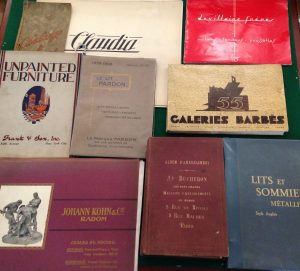 imprimée de l’éditeur. Usures à la reliure.{CR}- Sofa Claudia-Persia. / Juno-Gobelin / Claudia. S.l., [vers 1920]. — 3 chemises contenant au total 55 échantillons réalisés à la gouache dans les années 20 pour des tapis. Rare.{CR}- HUYGE. Manufacture de lits en fer et en cuivre fondée en 1856. – Sommiers et meubles métalliques. Lille, 1925. — In-4, demi-toile, attaches parisiennes.{CR}Catalogue illustré en couleurs avec liste de prix ajoutée in fine.{CR}- PARDON. Le Lit Pardon. Lits métalliques. Voitures d’enfants. Mobilier métallique. Album n° 65. 1925-1926. Paris, 1925. — In-4, couverture imprimée. Broché, cordonnet.{CR}- FRANCK & SON. Unpainted furniture. New York, 1929. — In-4, couverture illustrée. Agrafé.{CR}Catalogue illustré de mobiliers en bois brut. Joint un supplément au catalogue et la liste des prix.{CR}- GALERIE BARBES. Paris, [1935]. — In-8 oblong, couverture illustrée. Broché.{CR}Catalogue abondamment illustré de mobiliers divers. Pliure à la couverture. Il est joint à l’intérieur une publicité dépliante de 1940 du Bon Marché.{CR}- DEVILLAINE. Cet Album vous présente les voitures, landaux (sic), poussettes de la collection 1951 des établissements Devillaine frères. Saint-Etienne, 1951. — In-4 oblong, (8 ff.), couverture illustrée. Agrafé.{CR}Catalogue en couleurs de la maison Devillaine frères, distributeurs de Landaus, poussettes et voitures pour bébés. Nombreuses illustrations. On joint plusieurs documents dont des listes de prix.{CR}- CHALANGE & BONNET. Filets bois et bandes de mosaïque. Paris, s.d. — In-4 allongé, couverture imprimée. Cordonnet. Déchirures au dos de la couverture. [Item 757]{CR}- JOHANN KOHN. Radom, s.d. — In-4 oblong, couverture illustrée. Catalogue de mobilier en russe. Mouillures.