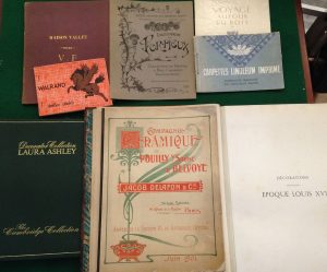 à prix marqués, de la maison Vallet, manufacture d’ameublements à Marseille. Nombreuses illustrations dans le texte. Dos passé et fente aux charnières.{CR}- COMPAGNIE CÉRAMIQUE DE POUILLY SUR SAÔNE & BELVOYE. Annexe à la section III du catalogue général. Balnéothérapie, Hydrothérapie, chauffe-bains, meubles-toilette en ébénisterie, lavabos en granit-porcelaine… Paris, 1901. — In-folio, couverture illustrée. Broché. Défauts à la couverture.{CR}- PORTIEUX. Établissement de Portieux, Collection de dessins & prix-courant – septième partie. 1914. — In-4, couverture illustrée d’un décor art nouveau, broché.{CR}Catalogue à prix marqués d’objets en verre proposés par la maison Portieux. Il comporte 9 planches en couleurs de vases, sucriers, beurriers, articles divers… Bel exemplaire malgré la couverture légèrement insolée.{CR}- LAURA ASHLEY. The Cambridge Collection. S.l., 1983. — In-4 carré. Toile verte de l’éditeur.{CR}Beau catalogue illustré en couleurs, comprenant de nombreux échantillons de tissus et de papiers peints.{CR}- NAIRN. Carpettes, Linoleum imprimé. [Sans nom : sans lieu, sans date]. — In-8 oblong, couverture illustrée en couleurs. Agrafé, cordonnet de coton gris.{CR}Catalogue de la Compagnie Française du Linoleum Nairn composé de 23 feuillets en couleurs montrant les divers motifs proposés par la maison. Taches à la couverture.{CR}- POULAIN (Gaston). Voyage autour du bois. Paris : Atelier A.B.C., [sans date]. — In-8 carré, couverture illustrée. Agrafé.{CR}Plaquette de promotion de la maison Soubrier illustrée de bois gravés de Renefer et de compositions hors texte en couleurs contrecollées sur papier fort d’après A. Rapeno. Bel exemplaire.{CR}- QUÉVERDO. Décorations intérieures époque Louis XVI. Frises, dessus de porte, panneaux, attributs, etc. Nouvelle édition sur les planches originales. Vingt planches gravées. Paris : A. Morel et Cie, s.d. — In-folio, demi-chagrin marron, tête dorée, non rogné (reliure de l’époque).{CR}- WALRAND. Toiles cirées. Paris, [sans date]. — In-16 oblong, couverture illustrée. Agrafé.