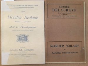 [MOBILIER SCOLAIRE]. Ensemble de 2 catalogues :{CR}- NISIUS. 1906. Mobilier Scolaire Modèles L. Nisius et Matériel d’Enseignement Confirmes aux plus récentes Instructions officielles. Paris : Librairie Ch. Delagrave, 1905. — In-8, 112 pp.,...