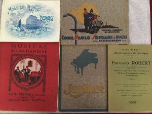 de réparations, et comprenant 8 partitions. Couverture et décorations intérieures dans le pur style art nouveau.{CR}- ROBERT (Édouard). Catalogue général d’instruments de musique et d’accessoires. Marseille, 1932. — In-4, couverture imprimée. Broché. Joints deux courriers de la manufacture avec factures, signés par Robert.{CR}- GUNTHER J. Manufacture de pianos J. Gunther. Bruxelles, [vers 1930]. — In-4, (4 ff.), couverture illustrée. Broché, lacet de soie bordeaux.{CR}Très beau catalogue de la maison J. Gunther, manufacture de piano fondée en 1845. Nombreuses illustrations en couleurs dans le texte, une gravure contrecollé, un portefeuille fixé à la couverture contenant les illustrations des différents modèles de pianos (un feuillet simple et deux feuillets doubles). On joint prospectus relatifs à la maison Gunther.{CR}- KEITH PROWSE & CO. Musical merchandise. Londres, [vers 1930]. — In-4, couverture illustrée. Broché. Reproductions en noir et 3 publicités intercalées en couleurs. Usures à la couverture.{CR}- SOPRANI & FIGLI. Grande Manufacture d’Accordéons. Castelfidaro, s.d. — In-4 oblong, couverture illustrée. Broché.{CR}Catalogue en français, publié dans les premières années du XXe siècle, de la première industrie italienne de l’accordéon. On y trouve 60 types d’accordéons, tous reproduits. Jolie couverture illustrée. Il est joint la liste des prix en italien.