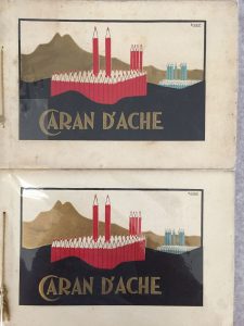 [PAPETERIE]. Caran d’Ache, le crayon de qualité. S.l., [vers 1935] — In-8 oblong. Broché, couverture illustrée en couleurs, reliée par un cordonnet de soie paille. {CR}Catalogue publicitaire du fabricant de stylos Caran d’Ache. Deux dessins...