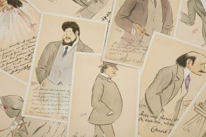 illustrations de SEM (1863-1934).{CR}« Pour vanter les mérites de ses stylographes, Onoto fait appel à des célébrités de l’époque… Ici nous voyons défiler, la Duchesse d’Uzès, Edmond Rostand, Auguste Rodin… sous la forme de malicieuses caricatures qu’ils dédicacent à Onoto de leur plus belle écriture » (in Pages d’Or de l’Edition Publicitaire, Forney, 1988). Ces personnalités épinglées sont : Edmond ROSTAND, Auguste RODIN, Baron HENRI de ROTHSCHILD, MOUNET-SULLY, Henry BERNSTEIN, Jean de RESZKE, M. MESSAGER, A. CAPUS, Duchesse d’UZES-MORTEMART, Maurice de FÉRAUDY. Cette dernière planche manque, petits plis internes et usures.{CR}