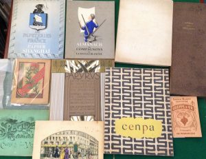 agenda des ménages contenant l’Agenda de tout le monde, le Livret des ménages et un Petit dictionnaire des ménages. Taches et usures à la reliure.{CR}- Spécimens d’écritures pour cartes de visite. Paris, [vers 1910]. — In-8 oblong, (5 ff.), couverture illustrée. Agrafé, dos de toile noire.{CR}- ROSEN. Papeterie de la Bourse. Ph. Rosen. Paris, [vers 1923]. — In-8 oblong, couverture illustrée en couleurs, agrafé.{CR}Catalogue de la maison Rosen, papetier et distributeur d’accessoires de bureau (encrier, sous-main…).{CR}Nombreuses illustrations dans le texte. Couverture illustrée d’une composition en couleurs de Boscher. Taches à la couverture.{CR}- Papyrus. Revue mensuelle de toutes les industries du papier. Paris, Août 1925. — In-folio, couverture illustrée d’une composition art déco en couleurs. Agrafé.{CR}Numéro spécial de la revue Papyrus, consacré à l’exposition internationale des arts décoratifs. On y trouve un important article consacré aux relieurs de cette époque. Déchirure au second plat de la couverture.{CR}- RICHARD DE BAS. Almanach de la feuille blanche. Paris : Éditions Elzévir, 1946. — In-8 carré, couverture illustrée. Broché, couverture rempliée.{CR}Almanach tiré à 1500 exemplaires (n°241), fruit d’un concours organisé par les Compagnons de la Feuille Blanche. « Il s’agissait d’illustrer un Almanach à la façon d’un Calendrier des Bergers ». Parmi les artistes qui ont contribué à l’illustration on relève : Jacques Schmit, André Leroy, Lainé, Vuillermoz, etc.{CR}Rousseurs à la couverture.{CR}- LA FEUILLE BLANCHE. L’Éloge du papier. Paris, 1948. — In-4, couverture imprimée. Broché.{CR}Nombreuses illustrations hors et dans le texte. Rousseurs éparses. Premiers feuillets en partie déreliés.{CR}- WEIBEL. Revue CENPA, éditée par la société centrale des usines à papiers et papeteries J.-B. Weibel réunies. Paris : Desfossés-Néogravures et Sapho, 1952. — In-4, couverture illustrée en couleurs, broché.{CR}Document consacré à l’impression sur papiers spéciaux d’emballage tels que la cellulose. Les textes et illustrations reproduits en héliogravure ont été imprimés sur papier Alpha « Cellunaf ». Couverture salie.{CR}- [Ensemble de trois albums à colorier]. Paris : Monrocq, [sans date]. In-12, broché, couverture imprimée en couleurs.{CR}Trois albums à colorier n°2, 3 et 6 (sur 20 numéros existants). La plupart des pages sont coloriées.{CR}- BERGÈS – FREDET – OUTHENIN-CHALANDRE. Les papeteries de France vous présentent leur papier Shangaï. Paris, [sans date]. — Plaquette petit in-4, couverture illustrée. Agrafé.{CR}Plaquette imprimée par Draeger, présentant le nouveau papier des Papeteries de France : le Shanghaï « mieux qu’un simili, c’est un presque Japon ».{CR}- SAVONNERIE DE LA GRAPPE. Savon Blanc concentré. Grappe d’or. Marseille, s.d. — In-16, couverture illustrée. Agrafé.{CR}Petit carnet vierge arborant sur la couverture une publicité pour la Savonnerie de la Grappe, maison marseillaise fondée en 1860.