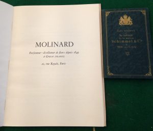 spécialisée dans la production d’huiles essentielles et des parfums artificiels. Nombreuses photographies en noir et blanc et 10 planches en couleurs, la dernière sur double page.{CR}- MOLINARD. Molinard, parfumeur – distillateur de fleurs depuis 1849. Montrouge : Draeger frères, juin 1949.{CR}Album édité par la parfumerie Molinard à l’occasion de son centenaire. Une gravure en couleurs et de nombreuses photographies.