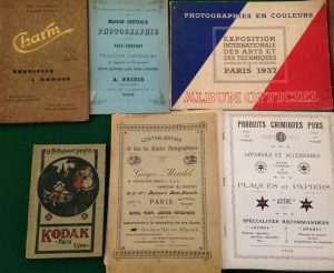 In-8, couverture imprimée. Petits manques à la couverture.{CR}- KODAK. Catalogue des appareils pellicules et accessoires. Paris, [vers 1900]. — In-12, toile illustrée d’édition.{CR}Beau catalogue illustré, orné de beaux encadrements art nouveau.{CR}- MENDEL (Georges). Centralisation de tous les Articles Photographiques. Matériel, produits, accessoires photographiques. Paris, [vers 1900]. — In-4, 44 pp. Agrafé. Déchirures sur le bord de la couverture.{CR}- ASTRE. Produits chimiques purs – Appareils et accessoires – Plaques et papiers. Paris, 1912. In-4, agrafé. Important catalogue illustré de matériels de photographie.{CR}- DUGNIOLLE & DEMOOR. Charm. Tout ce qui concerne le montage des photos. Halluin, Gand, Sas-Van-Gent : Dugniolle et Demoor, 1937. — In-8, reliure à spirale. Complet des 3 feuillets listant les albums, les 3 feuillets d’échantillons, le tract donnant le tarif des baguettes pour les cadres et un autre tract de tarifs collé à la fin.{CR}- Photographies en couleurs. Exposition Internationale des arts et des techniques appliqués à la vie moderne. Paris 1937. Album officiel. Paris : La Photolith, 1937. — In-4 oblong. Broché.{CR}Album de 32 photographies en couleurs des différents pavillons de l’exposition internationale de Paris de 1937. Couverture tachée, usures au dos.