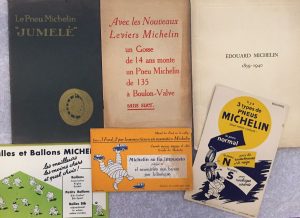 [PNEUMATIQUES] MICHELIN. Ensemble de 3 brochures et 4 buvards :{CR}- Avec les Nouveaux Leviers Michelin un Gosse de 14 ans monte un Pneu Michelin de 135 à Balon-Valve sans suer. S.l., [1913]. — In-8, couverture imprimée. Agrafé.{CR}Plaquette...