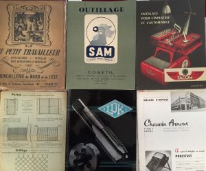 [QUINCAILLERIE - ANNÉES 50]. Ensemble de 9 catalogues ou brochures :{CR}- SAM. Outillage SAM vendu par Cogétil, comptoir d’outillage et de Matériel. Saint-Étienne, septembre 1950. — Catalogue illustrée in-4, 41 pp., couverture illustrée....