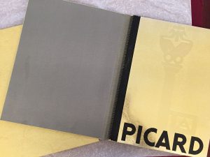 Reliure à spirale, chemise, étui moderne. {CR}Superbe réalisation de l’imprimerie Draeger mettant en avant les créations, en matière de serrurerie, des établissements Picard. Sur des pages à fond noir, sont contrecollées des planches imprimées en chromolithographies argentées ou dorées. Des modèles de clés, de serrures ou de poignées de portes sont présentés de manière élégante. Certaines réalisations sont signées par des décorateurs de l’époque. Citons la maison Dominique (dirigée par l’artiste André Domin), Puiforcat, Renouvin, … {CR}Bel exemplaire.