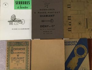 passe-partout « Diamant » pour portes, meubles-cadenas. Quincaillerie décorative, cuivre ciselé, fer forgé styles classiques et moderne. Paris, (1935). — In-4, agrafé.{CR}- MUEL ET FILS. Fabrique de serrures et verrous de sureté, de précision et ordinaire pour bâtiment, vitrine, meuble, fermeture métallique, etc. Paris, 1936. — Catalogue illustré in-8, agrafé.{CR}- V.A.Q. [Catalogue de serrures, verrous, crémones, etc]. Paris : impr. Lazare-Ferry, novembre 1961. — In-4, reliure à spirale.{CR}2 exemplaires de ce riche catalogue de serrures des établissements V.A.Q. Usures d’usage aux couvertures.{CR}- PICARD. Vigie Picard Paris. Paris, [vers 1970]. — In-4, agrafé.{CR}Catalogue consacré à la serrurerie. Belle couverture dorée et ornée d’une serrure dessinée en noir.{CR}- ND. Serrures à larder. Amiens : impr. A. Valade, s.d. — Brochure in-4 de 12 pp. Agrafée.