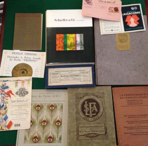 étoffes Gors, Roman et compagnie.{CR}- DOLLFUS-MIEG. Broderie exécutée en Soie de Perse D.M.D. Mulhouse, Belfort, Paris, [vers 1900]. — Carton publicitaire in-4.{CR}Belle publicité DMC présentant un grand échantillon d’une broderie en soie de Perse, modèle de l’album « Motifs pour broderies, IIme Série ». {CR}- SENNELIER. Le « Batik ». Procédé de teintures sur étoffes avec réserves à la cire par Reilennes. Paris, [vers 1920]. — In-8, couverture imprimée. On joint une facture.{CR}- L’ALSACIENNE. Verfstof l’Alsacienne. [Sans lieu, ni nom], [après 1925]. — 164 x 247. Nuancier distribué par la société L’Alsacienne, spécialisée dans la teinture pour textile.{CR}- FRIEDR. BAYER & CO. Réserves en blanc et en couleurs sous Noir Prud’homme avec Katanol O (échantillons provenant de la pratique). Leverkusen,[1926]. — In-4, couverture de toile imprimée. Agrafé.{CR}Catalogue quadrilingue (allemand, anglais, français, espagnol) exposant la technique de teinture de textile de la maison Bayer. Il comporte 34 échantillons en couleurs de tissus teints avec la technique Bayer. Cachet de la Hoogeschool sur le titre et le premier plat. Quelques rousseurs éparses.{CR}- FICELLE DEERING. Demandez la Pelote Lourde de Ficelle « Deering ». Paris, 1927. — Tract illustré in-4, plié.{CR}- Livre d’or édité par les successeurs d’Albert Godde, Bedin & Cie, Mondon & Cie. Paris, 1930. — In-folio, cartonnage de l’éditeur. Nombreuses photos et fac-similés. Défauts.{CR}- Livre d’Or de la Société Anonyme Lorthiois frères. 1780-1930. Notice historique publiée à l’Occasion du 150me Anniversaire de la Fondation de la Maison. S. l., 1930. — In-4, couverture illustrée. Broché.{CR}Nombreux échantillons de bobines de fils.{CR}- SCHAEFER & CIE. Pfastatt-le-Chateau, 1956. — In-4, couverture illustrée. Broché, étui.{CR}Superbe brochure publicitaire illustrée de nombreuses reproductions et photographies par Paul FACHETTI, A. PAPILLON, Willy RONIS, SCHAEFFER, A. BURGER et A.G. BALAIR.{CR}- DEPREZ (Achille). Ateliers de Construction Mécanique et Electrique. Bruxelles, s.d. — Étui boîte dépliant à 3 volets, contenant 66 échantillons de fils de soie et de fils glacés torsadé.