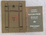 servir à une imprimerie (meubles et boiseries, outils, presses typographiques, machines à perforer, etc.), un exemple de tous les caractères en sa possession, des centaines de clichés-galvanos, des filets, des frontons, des culs-de-lampe, des vignettes pour encadrements, des attributs, des armes, des sujets divers, etc. Le corps du catalogue présente divers exemples de prospectus.{CR}Usures d’usage au cartonnage. Quelques rousseurs éparses.{CR}On joint :{CR}- VAN LOEY-NOURI. Catalogue des polytypages de la fonderie typographique Van Loey-Nouri. Bruxelles, (vers 1918). — In-4, broché.{CR}Très beau catalogue de milliers de vignettes proposées par la fonderie Van Loey-Nouri.{CR}- VAN LOEY-NOURI. Polytypages (Complément). Bruxelles, s.d. — In-8, couverture imprimée. Agrafé.{CR}Comprend 128 feuillets de clichés en galvano. Couverture insolée.