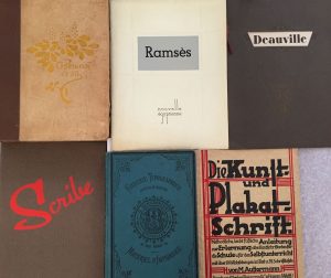 97.{CR}- PEIGNOT ET FILS. Spécimen général. Gravure, Fonderie, Galvanoplastie. Paris, [vers 1903]. — In-4, demi-toile d’édition.{CR}Important catalogue des caractères, ornements, vignettes, filets, ainsi que du matériel et des silhouettes que pouvait proposer la maison Peignot fils. Usures d’usage à la reliure, 3 feuillets découpés.{CR}- FONDERIE TURLOT. Spécimen de filets. Paris, [1905]. — In-8, percaline marron de l’éditeur.{CR}- LA FONDERIE TYPOGRAPHIQUE FRANÇAISE. Le Caractère Deauville. Nouvelle Création de la Fonderie Typographique française. Paris, vers 1925. — In-4, broché.{CR}Belle plaquette publicitaire composée de 4 feuillets de présentation des caractères, des vignettes et autres clichés, suivis de 10 modèles d’application sur différents papiers. Ces modèles, initialement agrafés à la plaquette, sont ici détachés.{CR}- LA FONDERIE TYPOGRAPHIQUE FRANÇAISE. 3 Belles séries Ramsès. Paris, (1933). — In-4, broché.{CR}Plaquette présentant les caractères Ramsès ainsi que les vignettes et clichés appropriés dessinés par Alex. L. Pinon. {CR}- DEBERNY et PEIGNOT. Écriture de publicité… Le Scribe. Caractère gravé et fondu par Deberny et Peignot. Paris, 1936. — In-8, (6 ff.), couverture imprimée. Agrafé.{CR}Plaquette présentant le dernier caractère d’imprimerie de Derberny et Peignot nommé « scribe », conçu par le dessinateur et maquettiste Marcel JACNO resté célèbre pour le fameux paquet de Gauloises. Exemplaire complet de l’affiche de la librairie Stock au format 355 x 530 mm, pliée en 4 et imprimée en caractères Scribe et Europe Étroit. Très bel exemplaire. {CR}- AUSTERMANN. Die Kunst-und Plakat-Schrift. Hamm : Druck und Verlag von Reimann & Co, [vers 1950]. — In-4, broché.{CR}Comprend 32 planches de calligraphie.