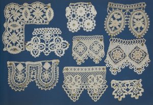 Fixés sur des feuillets forts de couleur bleue, montés sur onglet au moyen d’attaches parisiennes. De dimensions très variables (35 x 20 mm pour les plus petits à 125 x 515 pour les plus grands), ils sont pour la plupart réalisés en coton blanc ou crème de diverses grosseurs ; cependant on découvre parfois des échantillons en laine ou en coton bis ou brun.{CR}L’ensemble est homogène, il manque assez peu d’échantillons (comme l’indiquent les trous laissés par les attaches parisiennes), ce qui est rare pour des pièces de ce genre.{CR}Restauration à la charnière intérieure, frottement à la reliure.{CR}- Fort volume grand in-4, demi-toile bordeaux à coins, pièce de cuir portant la mention EVA LEGRAND sur le premier plat, dos lisse muet.{CR}Catalogue de 129 échantillons de dentelles au crochet collés sur des feuillets de couleur bleue. Il s’agit d’échantillons de formats et de dimensions très diverses (certaines pièces vont jusqu’à 160 x 350). On y découvre aussi bien des dentelles linéaires (pour réaliser les bordures de draps, torchons, rideaux…) que des pièces entières (napperons…). En majorité réalisés en coton crème ou blanc, on trouve parfois quelques échantillons intégrant un soupçon de rouge.{CR}Ex-libris sur le premier plat « Eva Legrand ».{CR}Les dentelles sont parfois un peu brunies par la colle de fixation. Plusieurs échantillons sont décollés et certaines pages on été abîmées par la colle. Dos refait, plats frottés.