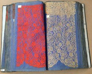 dentelle mécanique en couleurs, très probablement issus d’une maison de haute couture. D’une très grande finesse, les dentelles sont essentiellement réalisées avec des fils brillants et des fils de soie. On a trouvé, jointe à une des dentelles, une planche présentant un modèle de robe réalisée par la maison de couture Erem (vers 1920).{CR}Très spectaculaire, ce document propose des échantillons 220 x 375 cm, parfois plus grands. Chaque dentelle porte un numéro de classement ainsi qu’un nom sur une étiquette placée en haut à gauche.{CR}Comme c’était parfois le cas, certains échantillons (7) ont malheureusement été amputés d’un morceau de dentelle, confié aux futures acheteuses. Quatre planches on été entièrement découpées. Le lacet a cédé.