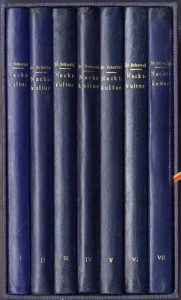 photographies pleine page en noir et blanc soit 1260 pages et 1008 photographies. Chaque volume : in-8 (24 x 16 cm), demi reliure en cuir bleu (quelques rousseurs sur les pages de texte mais pas sur les pages de photographie). 1. Nacktheit als Kultur / Heilig Jugend /Nacktkultur und Religion. 2. Die Eroberung des weiblichen Körpers / Ethik der Nacktheit / Das Evangelium des Leibes. 3. Nacktbaden / Nacktzauber / Scham und Laster. 4. Das Aktbild als Kunstwerk / Solen wir nackt gehen ? Mer Nacktheit. 5. Der Teufel der Sittlichkeit / Mucker und Lichtmensch / Das luxus-Weib. 6. Der Dienst am Körper / Leib, Weib und Satan / Weibes-Kultur. 7. Sinne, Seele und Sinnlichkeit / Spielarten des Weibes / Schönheit oder Unzucht ? 150 photographies de Rolf Herrlich, 96 d’Ernst Scherte, 94 de Th. WeiB, 78 de Lotte Herrlich, 74 de W. Kernspecht, 61 de Bruno Wolf, 38 de Maria Eder Hans, 28 de Manassé, 25 de Veres, 20 de Mme D’Ora, 20 de Willy Horn, 9 de Josef Pecsi, 8 d’Angelo et de nombreux autres photographes. Ref. Bertolotti pp. 112-113.