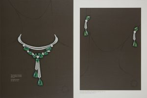 caractère », célébrant le centenaire de la célèbre maison Van Cleef & Arpels. Il se compose de 5 chemises, chacune dédiée à une ou plusieurs pierres précieuses, à l’intérieur desquelles sont déclinés les différents modèles de bagues, boucles d’oreille et colliers sur de fabuleuses planches en couleurs. Les photographies sont de G. Lucas de Peslouan.{CR}Exemplaire parfaitement conservé.