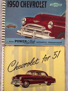 [AUTOMOBILES] CHEVROLET. Ensemble de 2 catalogues :{CR}- 1950 Chevrolet… with power glide automatic transmission. Detroit, 1950. — In-4 obling. Reliure à spirale, plats cartonnés illustrés.{CR}Beau catalogue avec éléments mobiles et...