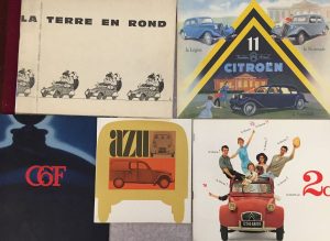 illustrations en couleurs.{CR}- 11. Traction avant Citroën. [Paris] : impr. Draeger, 1954. — Plaquette de 2 ff. in-4 oblong.{CR}Belle publicité pour la Citroën traction avant 11 dont la production dura 23 ans de 1934 à 1957{CR}- La Terre en rond. 100 000 kilomètres en 2 CV. par J.C. Baudot et J. Seguela. S.l., 1960. — In-4 oblong, couverture illustrée. Agrafé. Contient 10 photographies et 10 dessins humoristiques de César.{CR}- Azu. Paris : Delpire Publicité, [1965]. — Petit in-8 carré, couverture illustrée. Agrafé.{CR}Plaquette de promotion illustrée pour la camionnette Azu créée par la marque Citroën.{CR}- La Liberté en 2cv… Paris : Delpire publicité, [vers 1970]. — Plaquette in-4 oblong, agrafée.{CR}Belle publicité pour la mythique Citroën 2 Chevaux, ornée de nombreuses photographies en couleurs.