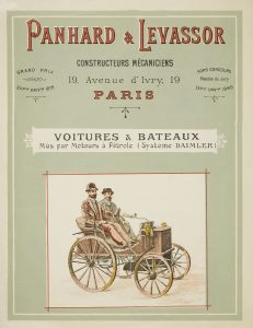 émane du premier constructeur d’automobiles au monde, la société Panhard & Levassor implantée avenue d’Ivry à Paris. Elle présente 4 types de voiture à pétrole : voiture à 4 places forme dog-cart ; voiture à 4 places forme Wagonnette ; voiture à 2 places avec parasol ; voiture à 2 places avec petit siège à l’arrière. Suit la publicité pour les bateaux munis d’un moteur Daimler.{CR}La plaquette est illustrée de la reproduction des différents véhicules décrits, dont une en couleurs au recto du premier feuillet où sont représentés Panhard et Levassor conduisant leur voiture 4 places forme wagonette.