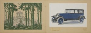 panorama photographié des usines, étui cartonné illustré. {CR}Edition publicitaire de grand luxe présentant les 9 modèles 1922 de la maison Panhard-Levassor, chacun d’entre eux reproduit par photogravure et présenté en double page vis-à-vis d’un paysage gravé sur bois en couleurs par Géo DORIVAL qui s’accorde au style de l’automobile (le Mont-blanc, l’Estérel en Provence, etc). Les plats présentent un superbe décor noir et or dans le style art déco. L’impression est d’une finesse et d’un soin infini à l’image de la marque.{CR}Exemplaire complet de l’étui d’origine nominatif.{CR}Le catalogue est parfaitement conservé mais l’étui est défraîchi et présente des déchirures avec manques et des décolorations.