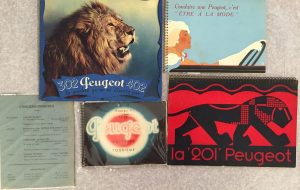Paris, 1933. — In-16 oblong. Reliure à spirale.{CR}Publicité illustrée pour promouvoir la 201 et la 301. Légères usures d’usage.{CR}- PEUGEOT. Tarif au 26 Mars 1933. S.l., 1933. — Plaquette de 2 ff. in-16. Prix pour les Peugeot 201, 301 et utilitaires.{CR}- Conduire une Peugeot, c’est « être à la mode ». Peugeot 201. Peugeot 301. Montrouge : Imprimerie Draeger, 1934. — In-12 oblong, (10 ff.), couverture illustrée. Reliure à spirale. Nombreuses illustrations dans le texte parfois à double page. Belle composition sur la couverture.{CR}- 302 Peugeot 402. Paris, 1937. — In-8 oblong. Reliure à spirale. Superbe publicité illustrée pour la gamme de voitures 302 et 402.