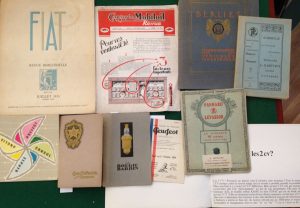 BERLIET. Communication sur les véhicules industriels. Lyon, [1911]. — In-4, couverture imprimée en couleurs,. Broché.{CR}Catalogue abondamment illustré. Bel exemplaire malgré la couverture en partie insolée.{CR}- CITROËN. Les 2cv en 1966. S.l., 1966. — In-4 oblong, couverture illustrée en couleurs. Agrafé.{CR}Plaquette promotionnelle consacrée à la 2CV. Photographies et dessins en couleurs dans le texte. Belle couverture dans le pure style des années 60.{CR}- FIAT. REVUE BIMESTRIELLE. 5 Juillet 1935. Paris, 1935. — In-folio, couverture illustrée. Broché. Illustrations de DOMERGUE, BÉNIGNI, etc. Débroché, couverture salie.{CR}- FORD. « Cinq étoiles ». Consul, Zephyr, Anglia, Prefect, Zephyr six. S.l., [vers 1955]. — In-12 carré, couverture illustrée. Agrafé.{CR}Nombreux croquis et photographies en noir et en couleurs dans le texte.{CR}- GARGOYLE MOBILOIL REVUE. Paris, juillet 1926. — In-4, agrafé. N°15 de juillet 1926 de cette revue du fabricant d’huiles pour voiture Gargoyle Mobiloil. Salissures. Jointe carte postale de la marque.{CR}- PANHARD-LEVASSOR. Conseils sur la Conduite et l’Entretien des Voitures 8 et 12 chevaux Cardan 3 vitesses. Paris, 1911. — In-8, couverture imprimée. Broché. Couverture insolée.{CR}- PANHARD-LEVASSOR. Le Châssis 15 chevaux sans soupapes. Paris, 1912. — In-8, 16 pp., couverture illustrée. Agrafé. Encadrement signé RV sur la première de couverture.{CR}- PEUGEOT. Tarif au 1er Octobre 1934. Paris, 1934. — Dépliant 4 volets in-16.{CR}On joint :{CR}- WONDER. Cycles Wonder. Saint-Étienne, [sans date]. — In-12, couverture illustrée. Dépliant sous couverture de papier côtelé. Nombreuses illustrations.
