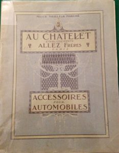 [AUTOMOBILES] AU CHÂTELET. Accessoires pour automobiles. Paris, 1911. — In-4, 140 pp., couverture illustrée. Broché. {CR}Très beau catalogue sortant des presses de Tolmer, imprimé en vert avec encadrement en jaune, contenant outre la...
