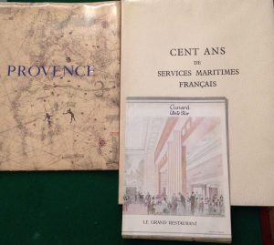 papeteries d’Arches présentant le paquebot Le Provence. Elle est notamment illustrée de compositions de Maurice Denis, Decaris, Cassandre, Chapelain Midy, Martin Roch, Cavaillès, Poillerat… Bel exemplaire.{CR}- SIEGFRIED (André) - THARAUD (Jérôme et Jean). Cent ans de services maritimes français. S.l., 1952. — In-folio, en feuilles, couverture rempliée.{CR}Ouvrage composé de textes d’André Siegfried et Jean Tharaud et illustré de bois dessinés et gravés par Patrick de Manceau. Un des 4500 exemplaires sur vélin de Rives. Bel exemplaire.{CR}- CUNARD WHITE STAR. R. M. S. Queen Mary. Paris : Bishop, s.d. — In-folio plié en quatre.{CR}Document faisant la promotion du paquebot anglais le « Queen Mary ». Nombreuses illustrations en couleurs. Restaurations au scotch.