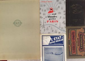 Paris : Logerot, 1862. — Grande carte entoilée rehaussée en couleurs. Usures.{CR}- WESTINGHOUSE. Tramways électriques. Londres : Tillotson, [vers 1910]. — In-8 oblong, couverture illustrée. Broché. Document illustré de nombreuses photographies.{CR}- L’état.. notre réseau. Revue mensuelle. Paris : Mayeux, [juin 1933]. — In-4, couverture illustrée. Agrafé.{CR}Revue mensuelle consacrée aux chemins de fer. Nombreuses illustrations et photographies dans le texte. On joint plusieurs prospectus sur les chemins de fer.{CR}- [JACQUEMIN (André)]. Le Cinquantenaire du chemin de fer métropolitain de Paris. Paris : RATP (impr. Nationale de France), 1950. — In-folio, couverture imprimée. En feuilles, couverture rempliée, étui.{CR}Recueil imprimé en Romain du roi par l’imprimerie nationale, tiré à 1000 exemplaires sur vélin de Rives, contenant deux textes respectivement d’Andrée Siegfried et de Gérard Bauer et 6 eaux-fortes originales d’André Jacquemin dont 2 hors texte.{CR}- DEVAL (Jacques). …and blondes prefer Paris. S.l., s.d. — In-8, couverture illustrée. Broché, couverture rempliée.{CR}Album publié sous les auspices de la société internationale des intérêts commerciaux, pour les chemins de fer de l’état, par Devambez. Il s’agissait de faire de la ville de Paris une des destinations fétiches des « blondes ». Avec beaucoup d’humour, Jacques Deval dresse une liste des adresses incontournables de la capitale.{CR}Nombreuses illustrations, style art déco en couleurs dans le texte. Petits accrocs à la couverture sans manque.