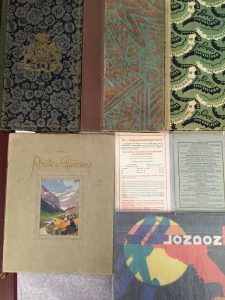 in-16.{CR}- COMPAGNIE DU MIDI. Chemins de fer du midi & d’Orléans. La Route des Pyrénées. Grand service d’auto-cars. S.l., 1914. — In-4, broché, couverture de papier grège retenue par un cordonnet de soie grège, illustration en couleurs contrecollée dans un cadre en relief rehaussé d’or sur la première de couverture.{CR}Brochure publicitaire de la Compagnie du Midi pour les services par la société Saurer d’autocars de la route des Pyrénées. Elle est illustrée de très nombreuses reproductions photographiques dans le texte, d’une carte dépliante placée en frontispice et d’une planche dépliante reproduisant une composition en couleurs de Jeanès. À la fin figure une publicité pour les automobiles industrielles Saurer.{CR}- PLM. Agenda PLM 1924 - 1929 et 1931. Paris, 1924-1931. — 3 volumes in-4, cartonnage demi-toile de l’éditeur.{CR}Collection de 3 almanachs de la compagnie des chemins de fer de Paris à Lyon et à la Méditerranée, chacun richement illustré de compositions hors et dans le texte, en noir et en couleurs, d’après Jacques Touchet, Astruc, Hermann-Paul, etc. accompagnées de textes de Maurice Maeterlinck, John Grand-Carteret, Georges Grappe, Edmond Haraucourt, etc. Quelques usures d’usage aux reliures. {CR}- GORDON HOTELS. London from Aloft. A pictural survey of the british capital city from a new angle. Londres, 1931. In-8, couverture illustrée. Broché.{CR}Catalogue des hôtels Gordon illustré de vues aériennes de la ville de Londres, entrecoupé des nombreuses publicités. Couverture illustrée en couleurs par V. Hicks. Déchirure sur un bord de la couverture.