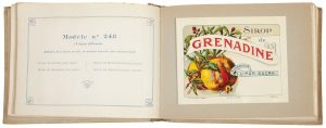 [BOISSONS] Wetterwald Frères. Assortiments d’étiquettes. {CR}2 petits volumes d’échantillons : modèles pour liqueur et modèles pour sirop.{CR}13,5 x 17,5 cm{CR}On joint :{CR}3 tarifs Nicolas signés Gentil, Latour et Eric ainsi qu’un petit...