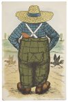 Knight. Elle était installée à Providence, capitale de l’état du Rhode Island (RI) à 80 km au nord de Boston. {CR}Au début des années 1890, la société se lance dans la carte postale publicitaire et met au point des modèles de cartes parmi les plus créatifs et originaux jamais édités.{CR}Les premières cartes («Early Pioneer Period ») sont éditées entre 1892 et 1898 (numéros 1 à 188). Il s’agissait de cartes simples, en couleurs, conçues avec une pochette - ou bien sur lesquelles était rajoutée une petite poche secrète - contenant le feuillet publicitaire de la firme cliente imprimé sur un papier très fin et fragile. Au verso de la carte, côté adresse, on trouvait dans la zone d’affranchissement un dessin en rapport avec le thème du recto. {CR}Ces cartes étaient vendues par des représentants de commerce qui aidaient à rédiger le texte personnalisé du feuillet publicitaire, dans le style de l’époque et toujours en étroite relation avec le thème choisi pour la carte. C’est pourquoi on peut parfois trouver pour un même modèle de carte des annonceurs variés selon les villes, les états. Certains annonceurs sont des « habitués ».{CR}Entre 1898 et 1901, les cartes de l’Age d’Or s’embellissent de divers ornements et deviennent de véritables chefs d’œuvre. L & K publie fréquemment de cartes de grande dimension et recourt à des ajouts de matériaux (ficelle, grillage, papier de verre, plume, etc.) ou d’éléments prédécoupés qui rendent ces cartes à système tout à fait uniques. {CR}Entre 1902 et 1910, les cartes de la Période Classique se replient avec un système de languettes habilement dissimulées et s’ouvrent sur le message imprimé de l’annonceur directement sur la carte. Le génie de ces cartes réside dans l’inventivité du graphisme mêlée à la force du trait.{CR}Les cartes L & K portent une date de copyright et un numéro dont la suite logique n’est pas toujours respectée (certaines sans n°) et ne mentionnent le nom d’aucun illustrateur. Les tirages nous sont inconnus. {CR}La collection proposée comporte 74 cartes dont 56 sont absentes de la liste établie par le spécialiste américain Dan Friedman. Les cartes sont – sauf mention contraire - en excellent état. {CR}Les dimensions données en cm commencent par la hauteur – Mention DF si dans la liste du Dr Friedman.- La date en gras est la date de Copyright.{CR}(Sources : Dr Dan Friedman The Birth and Development of American Postcards : a history, catalog and price guide to US Pioneer postcards – December 2003 – Plaquette du cinquantenaire de la firme : Fifty years of a pioneer spirit . 1925){CR}{CR}Early Pioneer Period (1892 – 1er juillet 1898){CR}36 : Mail Box on street pole 1893 – (13.2 x 7.7) - Boîte aux lettres rouge ouvrante– sans le message{CR}42 : Indian Teepee 1893 – (9.8 x 14) DF le message publicitaire est sur le teepee qui se déplie – teepee légèrement écorné) – Pour Bay State Carpet & Furniture à Boston – {CR}88 : Éléphants rouges (au recto) Know all men (au verso) 1894 – (8.7 x 20.3) – avec système d’ouverture intact - grand feuillet pour Mc Phail Boston Symphony – facteur de pianos{CR}96 : Mail Box on Coast Will passing ships please forward letters. 1895 – (13.3 x 7.7) – {CR}pour un photographe L.E. Brackett à Morrisville{CR}100 : Postman 1892 – (7.8 x 13.1) pour un marchand de fils de soie Brainerd & Armstrong Co typographie « chinoise » - au verso message demandant au facteur de se dépêcher.{CR}120 : Donkey with large reed basket on back 1895 - (9 x 14) DF – dans le panier de l’âne message en accordéon de 39 photos publiées par Shell View Syndicate New-York : Coney Island in a nutshell. Coins émoussés. {CR}120 ::Donkey with large reed basket on back 1895 - (9 x 14) DF – dans le panier de l’âne message plié en 4 pour Meyers Putz Pommade Co. Au verso, pas d’espace adresse mais poème pour l’annonceur – qq rousseurs{CR}134 : Lift him by his ears 1896 - (13.7 x 8.8) – le lapin derrière son grillage attend qu’on lui tire les oreilles. Elles sont attachées au feuillet publicitaire qui renferme un micro catalogue de 8 modèles de pianos et orgues pour Needham Pianos and Organs New York. Verso rouge avec dessin de lapins attablés.{CR}135: Treasure chest in cave inscribed Captn Kydde. 1896 (9 x 13.7) DF – Le coffre se déplie sur un message imprimé pour Smiths Office Tickler à Providence {CR} 138: Box trap with sign, Pull him out by his tail. 1896 (13.8 x 9) DF – On tire sur le bout de queue en feutrine noire qui dépasse de la boite en bois et auquel est attaché le message publicitaire de Lumbermen’s credit association (papier fendu à une pliure) pour son guide des acheteurs de bois d‘œuvre financièrement fiables. Signé « A. Victim »!{CR}{CR}144 : Pull her leg 1896 (16.8 x 9.2) Jolie dame à la bottine rouge – On tire sur la bottine pour obtenir le message pour le tailleur - Chas Ahlswede à Chicago Men and boys outfitters - le message insiste sur sa différence avec les concurrents indélicats qui mentent (leg pulling) – message déchiré en partie aux pliures et bottine scotchée {CR}150 : Xmas Pudding on plate. 1896 (10 x 13.2) DF le pudding est enfermé dans une aumônière fermée par une cordelette. Impossible à ouvrir pour découvrir le nom de l’annonceur. Verso superbe avec feuilles de houx de saison –{CR}181 : He doesn’t wear Monarch pants 1897 (13.6 x 8.6) L’homme de dos porte un chapeau de paille et un pantalon en crépon taupe, il est sur une plage face à la mer. Le message caché dans le pantalon est pour la société MINER, BEAL & Co à Boston qui vend le pantalon Monarch – Au verso, emplacement du timbre dans un sac de voyage et parapluie. {CR}187 : Three ducks on water with saying, The one that is tail up, has hold of a good thing pull him out. 1898 (13.8 x 9) DF – Le message est dans le croupion du canard qui plon