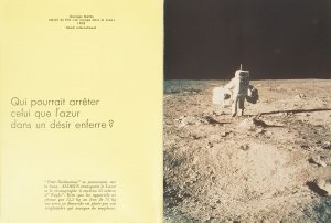 numérotés hors commerce.{CR}Deux pochettes de 12 diapositives couleurs chacune tirée à 1000 exemplaires.{CR}Plaquette réalisée à l’occasion de la mission d’Apollo XI et les premiers pas de l’homme sur la lune.