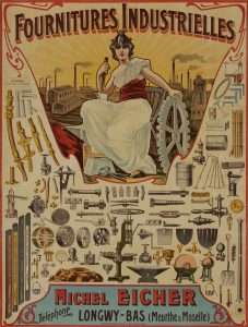 [PUBLICITÉ] Fournitures industrielles Michel Eicher, Armand Breger et Lang, Paris. Circa 1900.{CR}Affiche lithographique. {CR}63 x 47 cm{CR}Bon état, sous passe-partout.