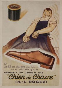 [QUINCAILLERIE] 2 affichettes montées sur baguette :{CR}- Les fils de lin et de chanvre Rogez{CR}40 x 30 cm{CR}- Chien de chasse, véritable vin câblé 6 fils, Rogez{CR}44 x 32 cm{CR}On joint : {CR}- Carlhian Frères, Manufacture of all kinds of...