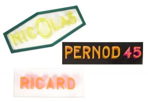 [TYPOGRAPHIE] 3 maquettes typographiques de lettres en plexiglass en relief pour RICARD, PERNOD et NICOLAS.