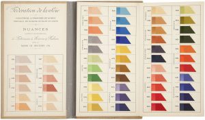 Soierie, Carte de nuances, automne-hiver 1957-58.{CR}- Brauns’sche, Gardinenfarben (rideaux).{CR}- Nuancier des Soieries de Stuttgart, B. Anilin & Soda Fabrick.{CR}On joint :{CR}Maboux et Camell, Liste des colorants substantifs et basiques, nuancier, 1923.