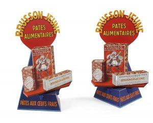 [PUBLICITÉ] Pâtes alimentaires Brusson Jeune.{CR}2 présentoirs publicitaires dépliants en découpe.{CR}45 x 28 cm{CR}On joint : Une petite plaquette publicitaire.
